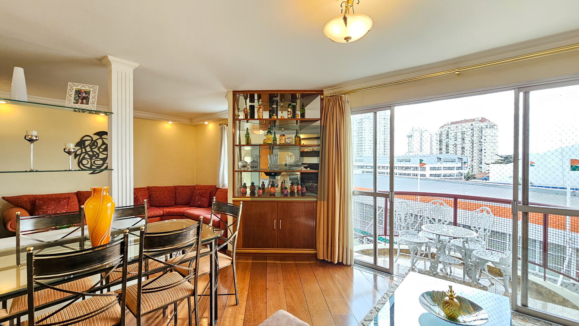Área social comsala ampliada para três ambientes, com móveis planejados, piso em madeira natural e varanda com vista livre.
