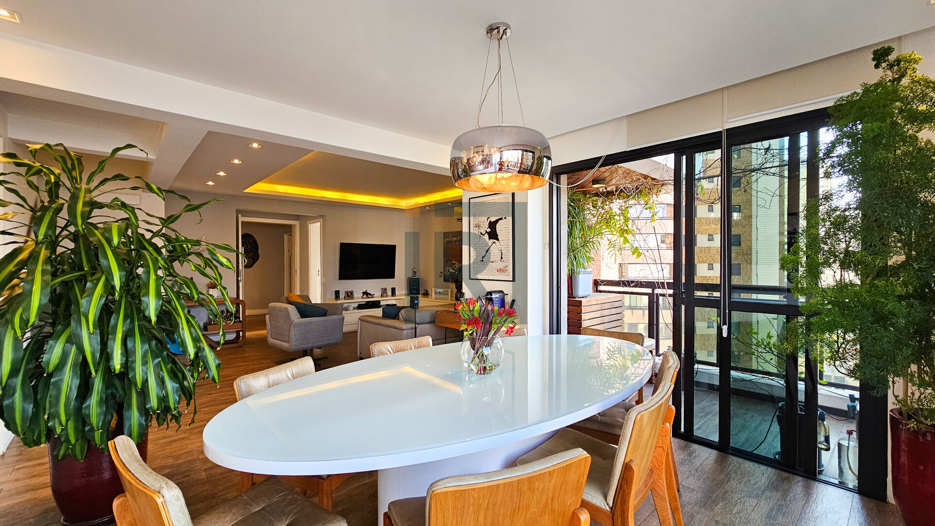 Área social com sala integrada ao hall privativo, com varanda e vista livre. Piso em porcelanato, sanca de gesso com iluminação embutida, móveis planejados e ar-condicionado.