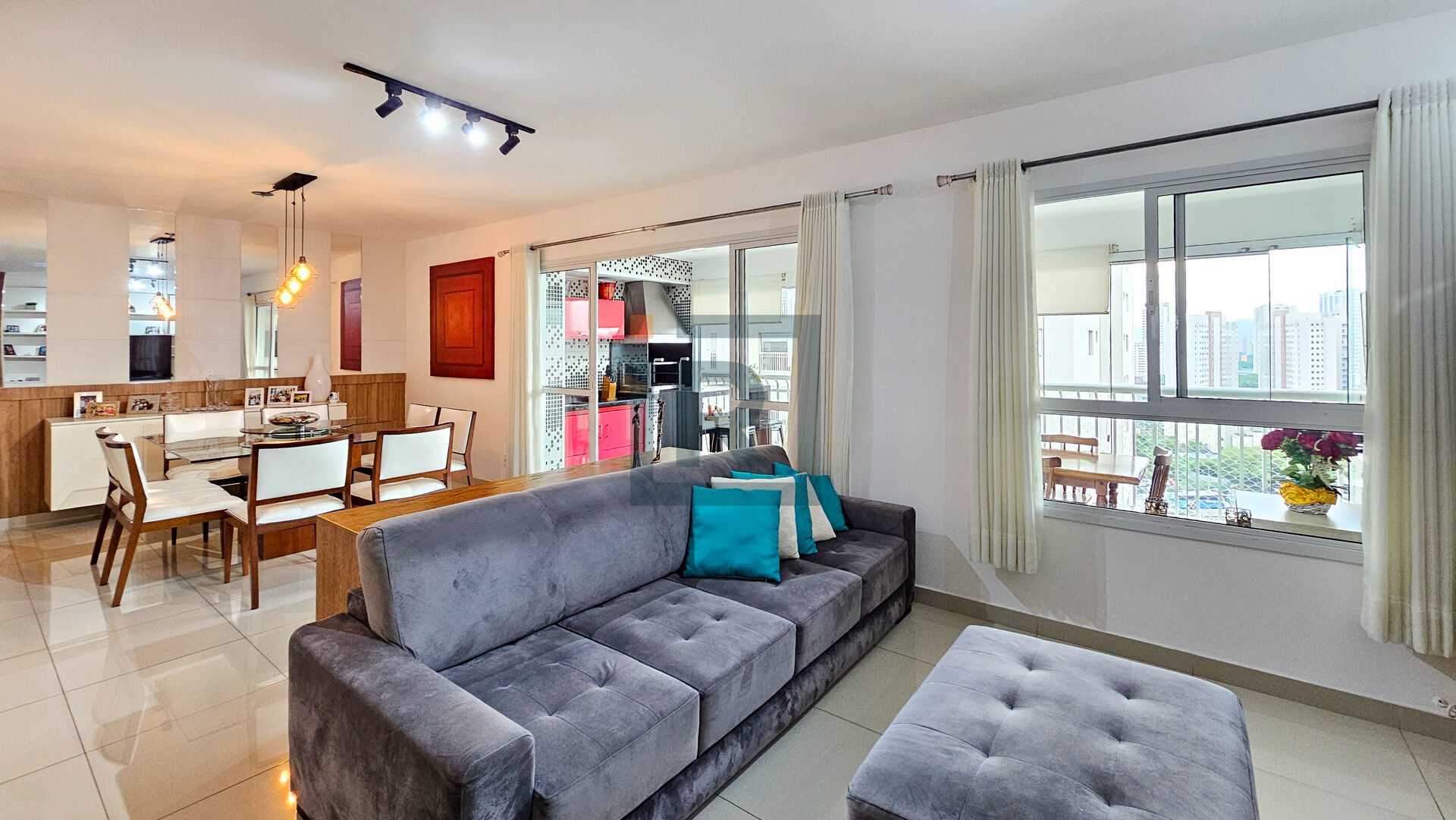 Área social com sala para dois ambientes e varanda gourmet envidraçada. Piso em porcelanato, ar-condicionado, móveis planejados e lavabo.