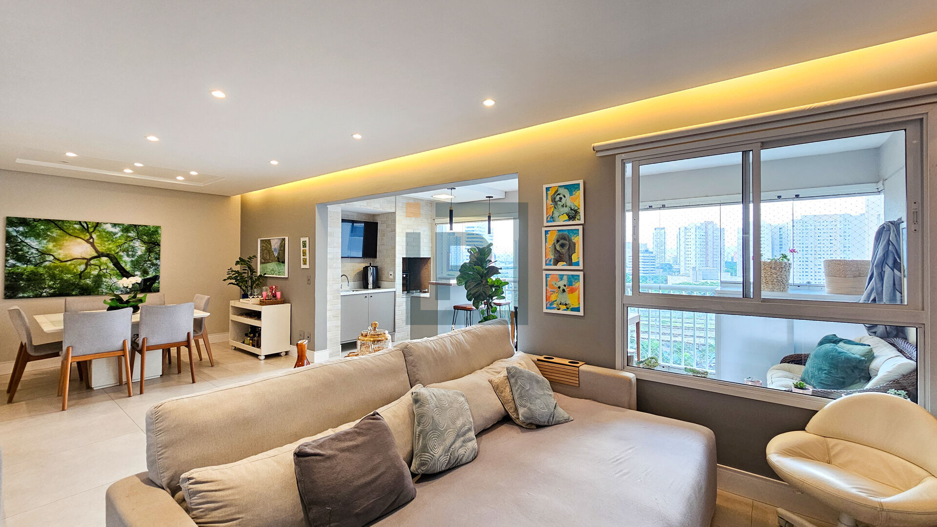 Área social com sala para dois ambientes integrada à varanda gourmet com churrasqueira a carvão, piso em porcelanato, móveis planejados, ar-condicionado e lavabo.